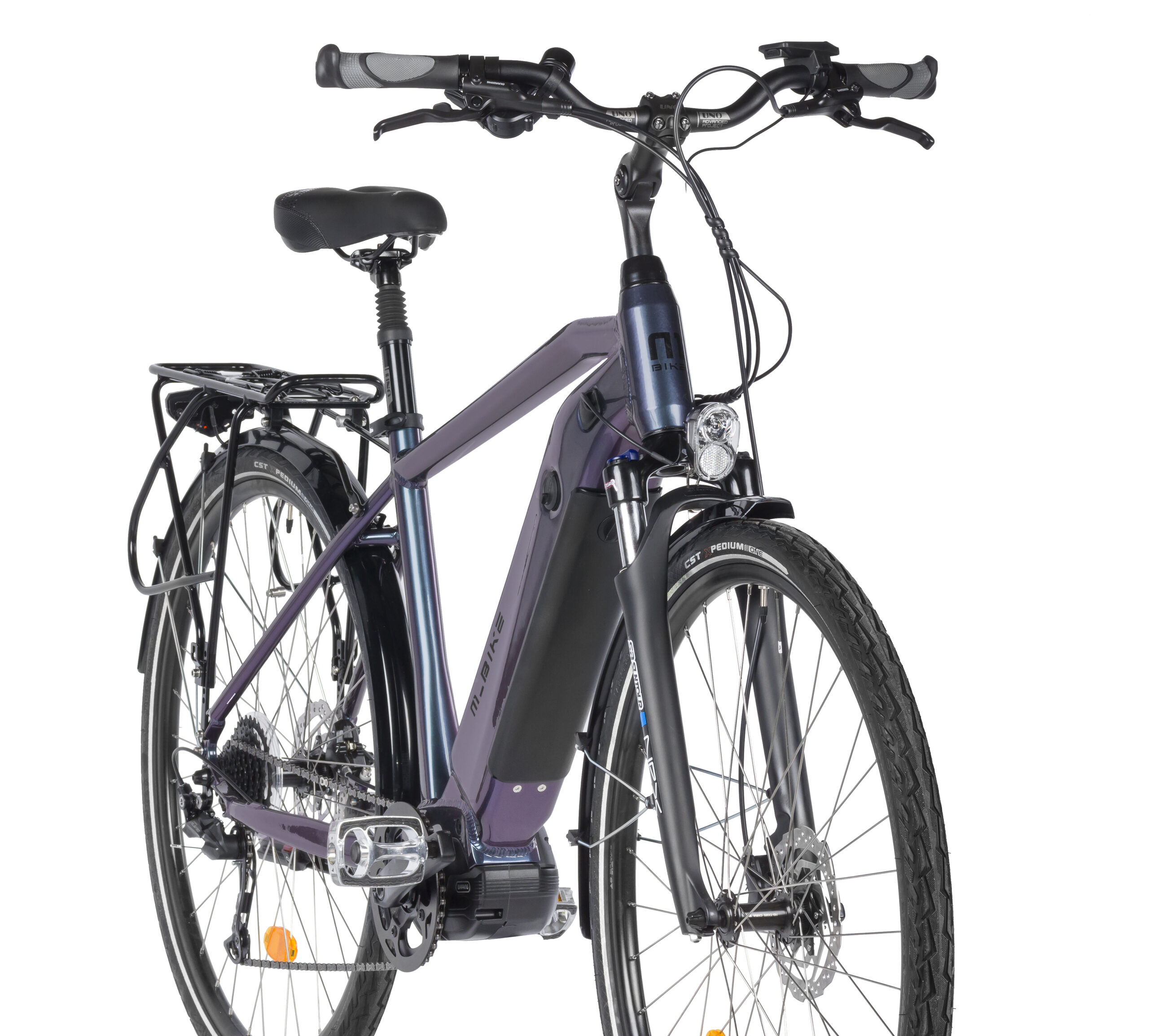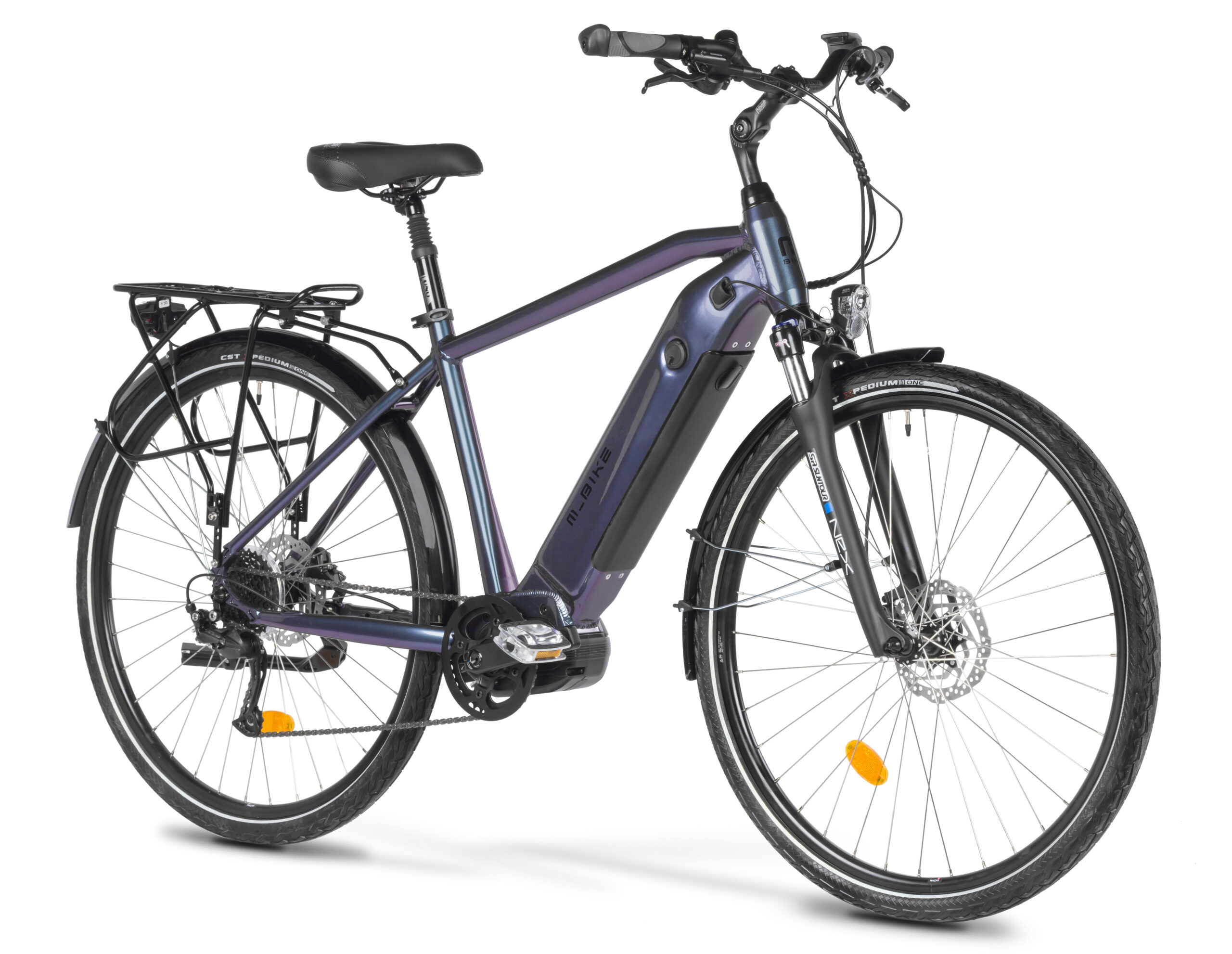 Poczuj więcej energii na każdej trasie! Zapewni ją M_Bike eT.Bike 3.0. To rower elektryczny nie tylko do miasta, z bogatym wyposażeniem, które może się przydać podczas dojazdów do pracy i na wyprawie. Ten trekkingowy e-bike łączący zalety roweru turystycznego i miejskiego ma mocną aluminiową ramę dającą wygodną wyprostowaną pozycję do jazdy, z wewnętrznym prowadzeniem przewodów dla ich ochrony przed brudem i wilgocią. Mocne wsparcie zapewnia silnik Bafang M420 z maks. momentem obrotowym 80 Nm i mocą 250 W, zasilany wewnętrzną baterią o pojemności 630 Wh. Szeroki zakres przełożeń daje napęd 1 x 9 z przerzutką Shimano Alivio i kasetą 12-32, a komfort jazdy zwiększają przedni amortyzator SR Suntour NEX oraz regulowany mostek i amortyzowana sztyca. Bezpieczeństwo w różnych warunkach poprawiają hydrauliczne hamulce tarczowe Shimano MT200. Na wielu trasach sprawdzą się mocne koła 28″ Mach1. Ten e-bike ma dodatkowe wyposażenie, które przyda się zarówno na codziennych trasach, jak i na wyprawie. Obejmuje ono oświetlenie AXA, aluminiowy bagażnik, błotniki SKS i stopkę. M_Bike eT.Bike 3.0 stać na wiele, możesz się o tym przekonać na różne sposoby.
